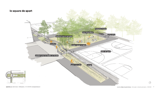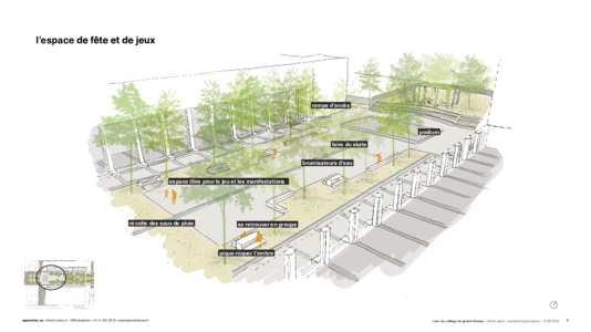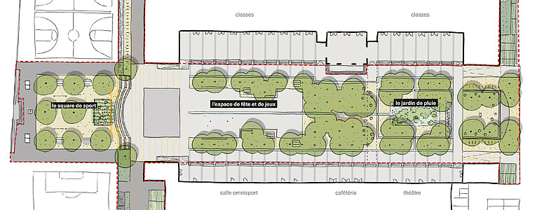 Inspirée du célèbre jardin de l’Alhambra à Grenade, leur vision conserve l’esprit architectural du site tout en faisant la part belle à la végétation et à la fraîcheur. Trois zones complémentaires sont prévues : un square de sport relié à la cour par des gradins et une rampe ; un espace de fête et de jeux propice à l’accueil d’événements ; ainsi qu’un jardin de pluie conçu pour créer une atmosphère agréable. Des canaux de pierre y mèneront les eaux pluviales jusqu’à un bassin peu profond, agrémenté de plantes de berge. L’ensemble serait ponctué de nombreux arbres, de revêtements perméables et de mobilier multifonction – notamment adapté à la pratique du skate.
