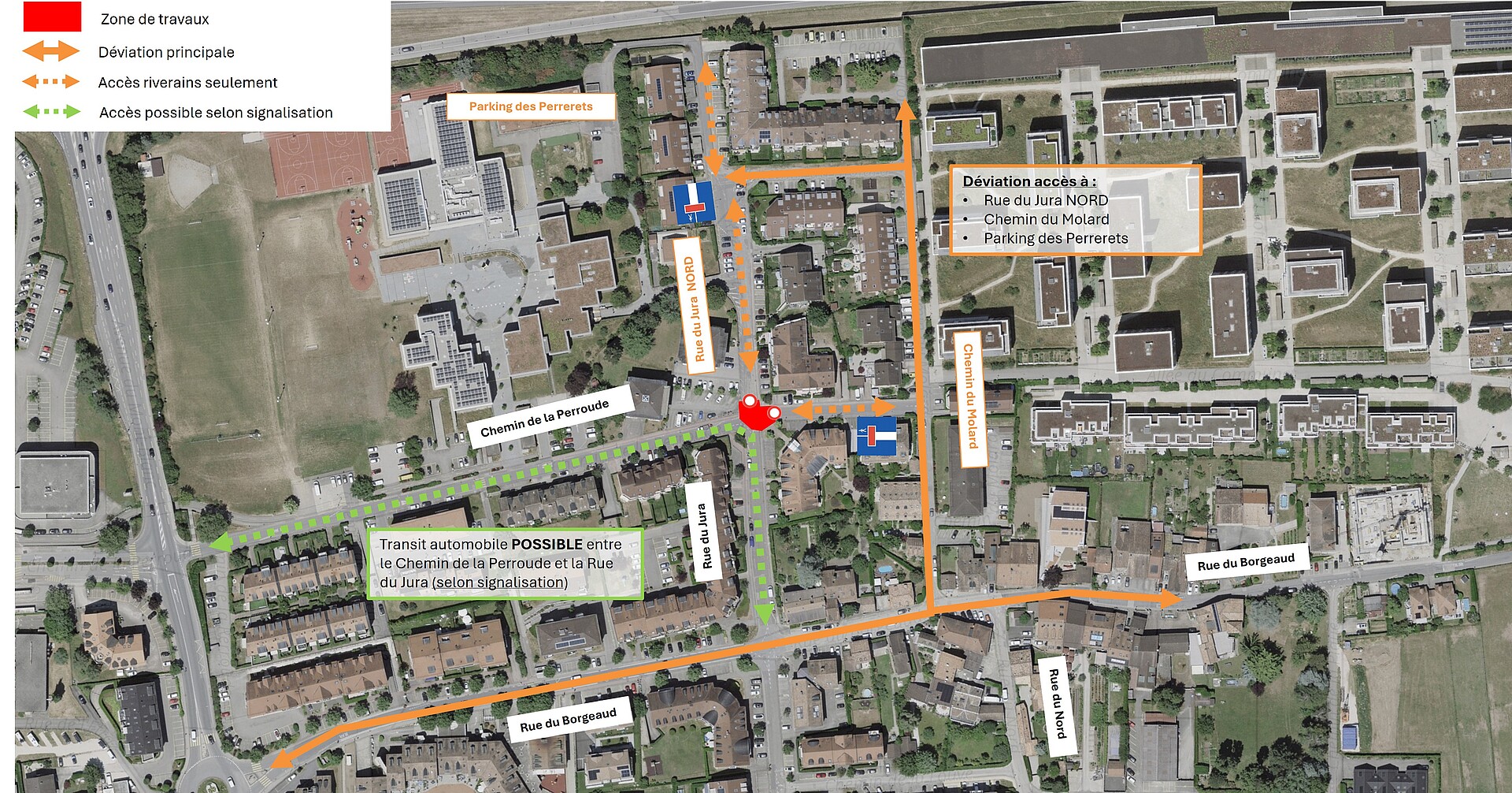 - Le transit automobile entre le chemin de la Perroude et la rue du Jura (au sud de la Perroude) restera possible.