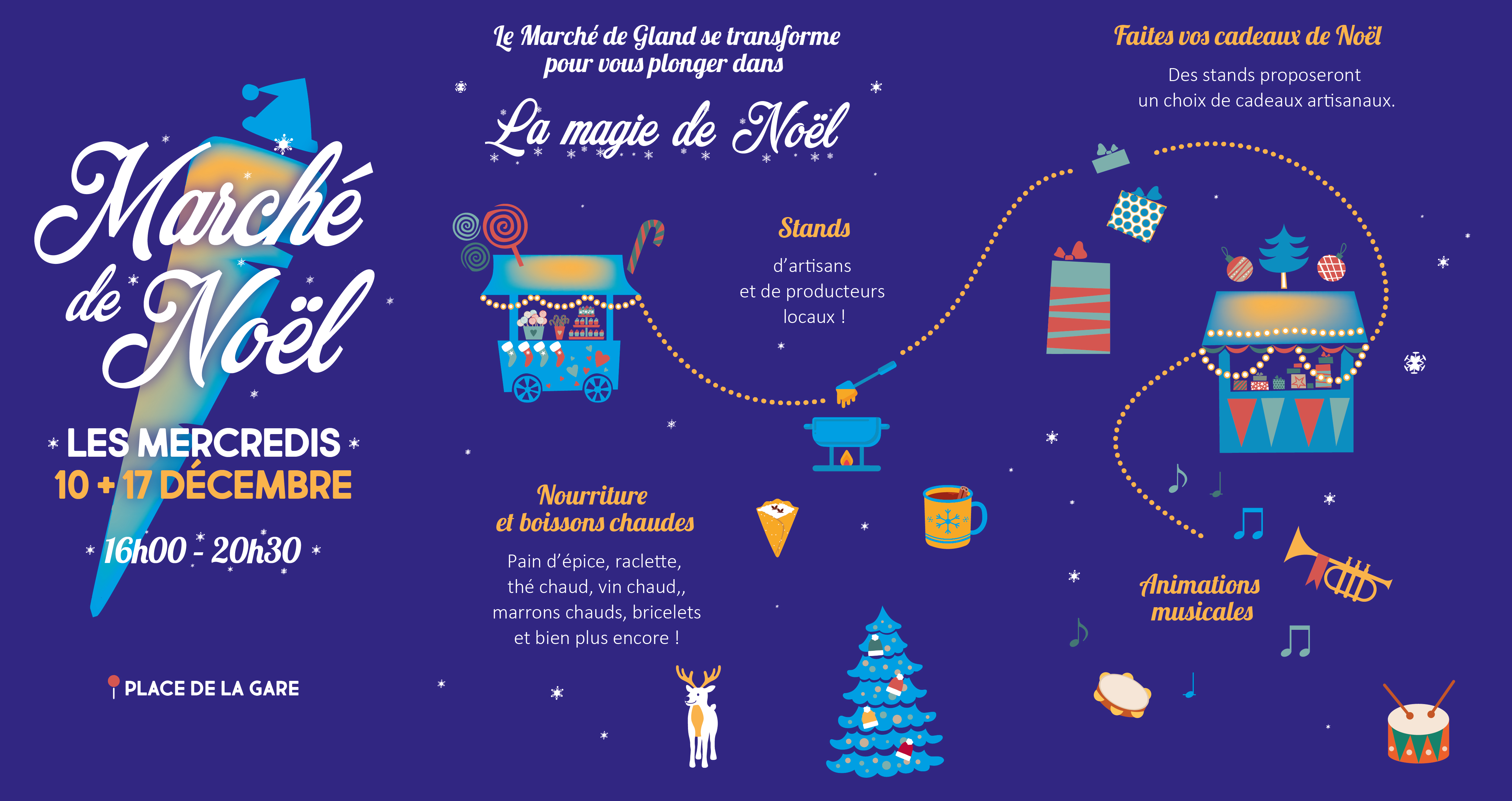 Le Marché de Gland se transforme en un véritable village de Noël les mercredis 10 et 17 décembre 2025, de 16h00 à 20h30 avec plusieurs stands d’artisans et de producteurs locaux.