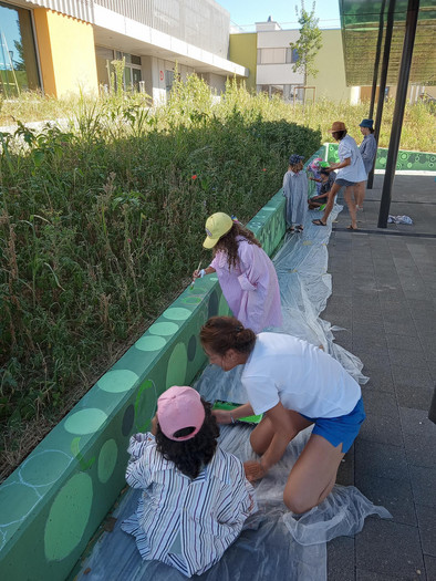Une couturière est venue nous expliquer que ce serait bien de réutiliser les habits qui ont déjà été fabriqués pour protéger la planète, alors on a pris des anciens tissus et on en a fait des chouchous. Ça m’a bien sensibilisée à l’écologie. On a aussi peint sur les murs des Perrerets avec une artiste de Gland, on avait chacun un rond à colorier pour que ça fasse une fresque géante un peu abstraite et le rond marquait notre empreinte justement. Et puis on a fait des activités cuisine qui étaient hyper bien, par exemple on a fabriqué nos propres barres de céréales et elles étaient trop bonnes, j’ai pu piquer un peu de chocolat. [rires]